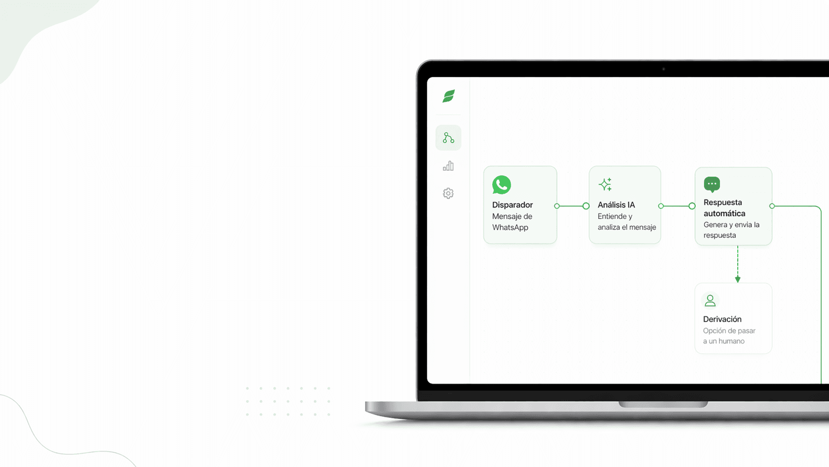 Plataforma no code con un editor visual de arrastrar y soltar, lógica condicional y soporte para la API oficial de WhatsApp Business. Incluye gestión de campañas segmentadas, integración con Dialogflow para capacidades de IA/NLP, bandeja de entrada compartida para traspaso humano y analítica de flujos.